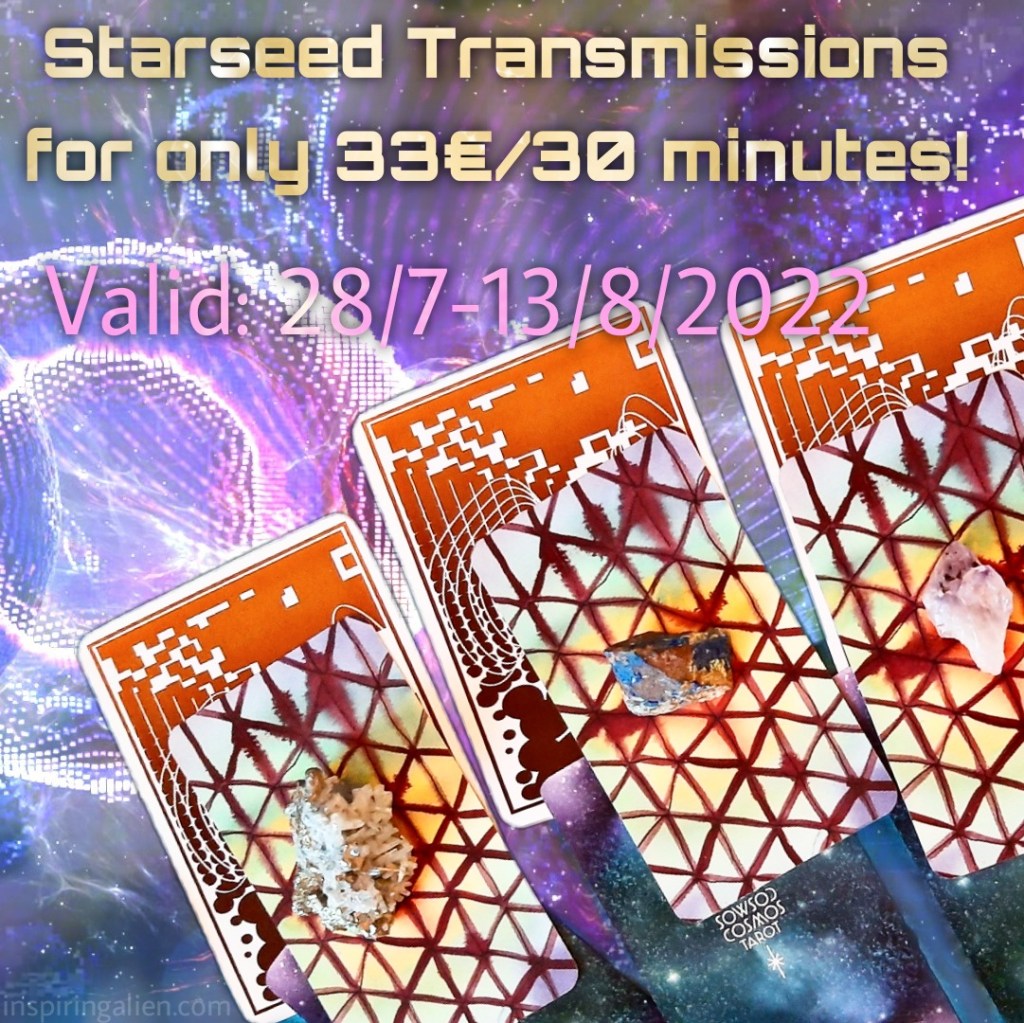 My Starseed Tarot Transmissions are only 33€ for 30 minutes (regular price: 55.55€/22min), which is more than just a simple reading. I offer energetic assistance while I read the cards and guide you. You can watch some videos from my “Alvia’s Telescope” playlist to get an idea, however some of you might already be aware that this is for you based on the energy.